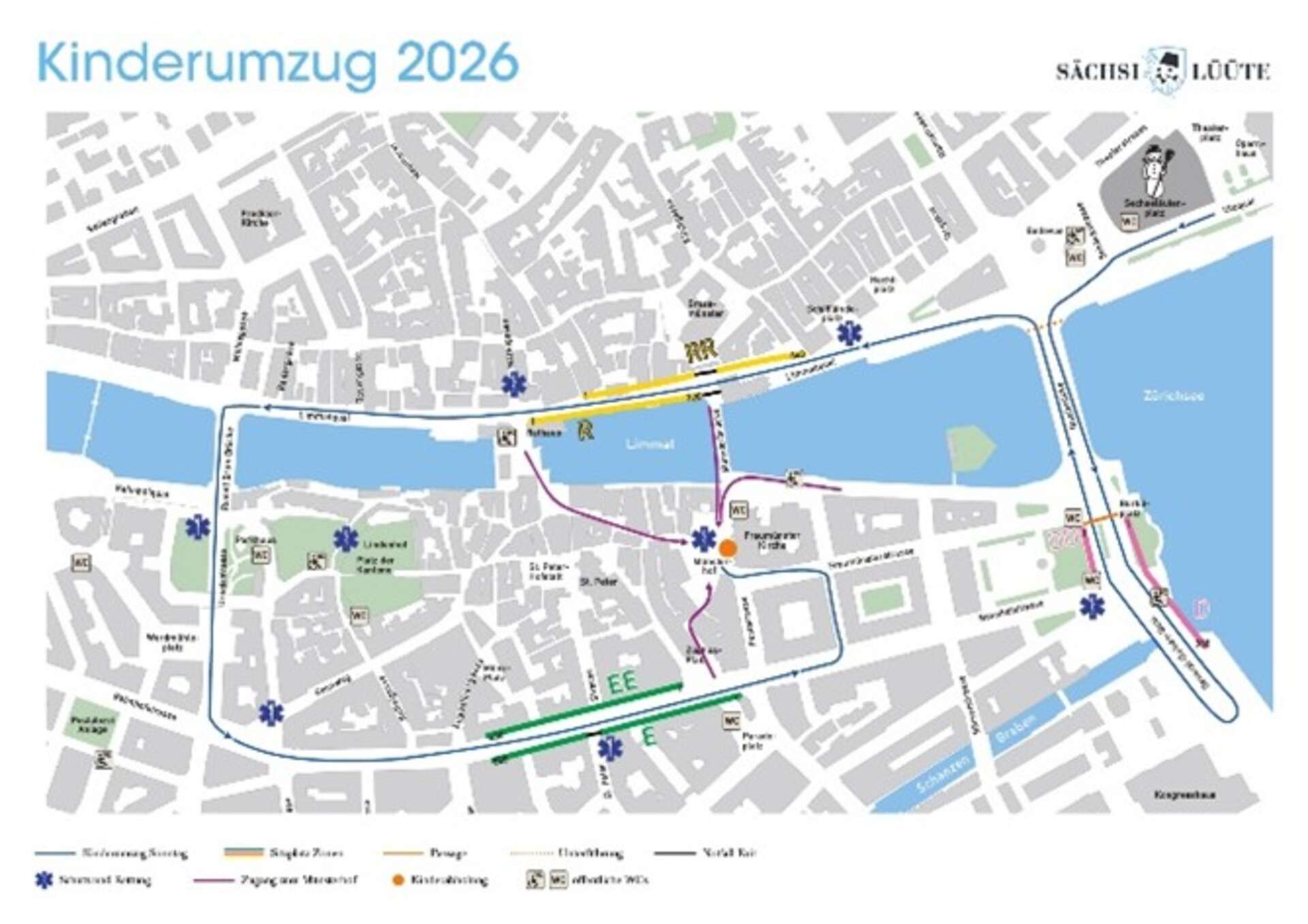 Die Route ist rund drei Kilometer lang und führt vom Bellevue über die Quaibrücke – General-Guisan-Quai (bis Höhe Kongresshaus) – Kontermarsch zurück zur Quaibrücke – Limmatquai – Rudolf-Brun-Brücke – Bahnhofstrasse – Kappelergasse – Fraumünsterstrasse – bis auf den Münsterhof. Der Kinderumzug findet bei jeder Witterung statt.